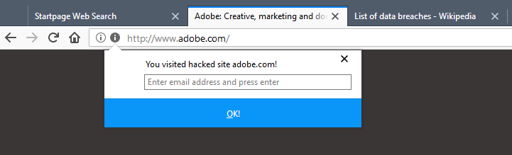 "Вы посетили взломанный сайт adobe.com. Введите email-адрес и нажмите enter". :)