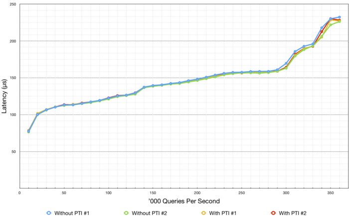 " The first pair of runs (the first done with KPTI, the second without) gave a surprising result – the latency at high query rates was about 8% lower with KPTI than without, when it was expected to be higher! "