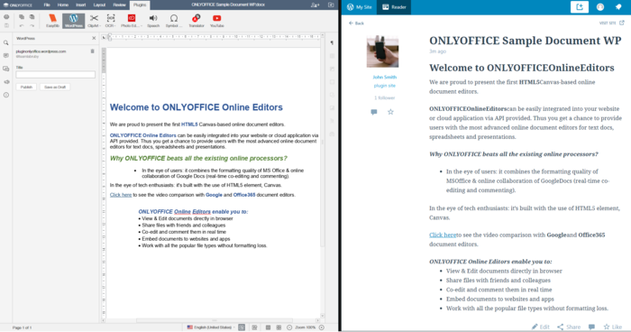"WordPress - позволяет добавлять контент на свой сайт в WordPress непосредственно из онлайн-редактора ONLYOFFICE. Для публикации необходимо предварительно подключиться через меню плагина в своем аккаунте на WordPress. Картинки, автофигуры, таблицы и некоторые другие объекты не будут сохранены при публикации ввиду внутренней специфики WordPress."