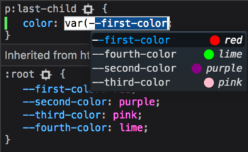 • В режиме инспектирования для просмотра переменных CSS теперь достаточно подвести курсор и параметры будут отображены на всплывающей подсказке. Так же добавлена поддержка автодополнения переменных CSS c наглядным отображением значений цветов;