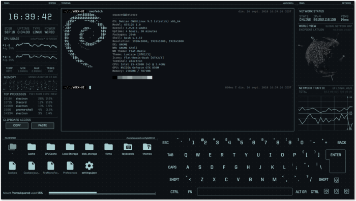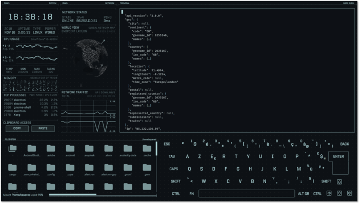 > В рамках проекта eDEX-UI подготовлено консольное окружение, оформленное в стиле компьютерного интерфейса из фантастического фильма Tron Legacy. Окружение построено с использованием платформы Electron