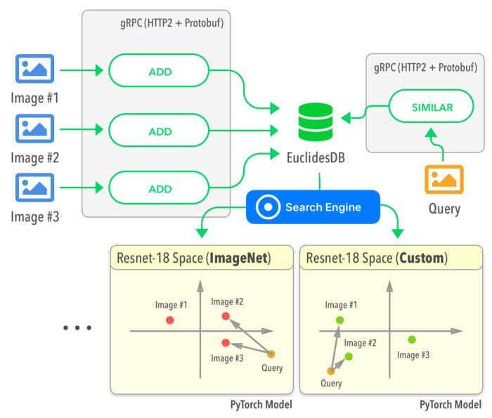 При добавлении новых данных в БД, например, изображения, вместе с данными указывается модель машинного обучения, которую следует применить для индексации. Результаты обработки сохраняются в локальное хранилище в формате ключ/значение, и используются при построении индекса запросов. При обработке запроса похожих элементов, переданный в запросе эталонный элемент обрабатывается с использованием одного из выбранных алгоритмов поиска похожих объектов. В запросе определяется допустимый диапазон моделей, которые следует использовать при поиске. На выходе для каждой из выбранных моделей возвращается список наиболее близких элементов с указанием уровня релевантности.