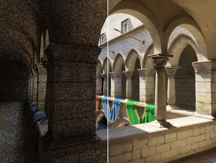 короче генерит картинку используя неполный рендеринг (на картинке слева) и таким образом вместо трассировки в 3д обрабатывается 2д