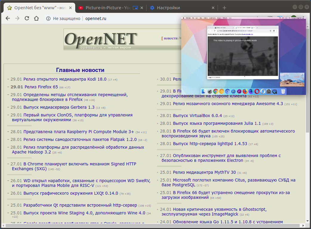 >>Включена по умолчанию возможность просмотра видео поверх контента в режиме "картинка в картинке" (Picture-In-Picture), позволяющем отсоединить видео в форме плавающего окна, которое остаётся на виду в процессе навигации в браузере. Для просмотра в данном режиме видео с YouTube необходимо два раза кликнуть на видео правой кнопкой мыши и выбрать режим "Picture in picture".