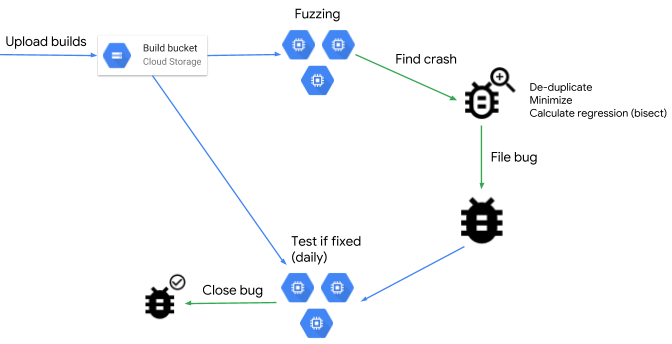 отправка уведомления разработчикам, создание заявки на исправление (issue), отслеживание исправления ошибки и закрытие отчётов после исправления. Код написан на языках Python и Go, и распространяется под лицензией Apache 2.0. Экземпляры ClusterFuzz могут запускаться на системах под управлением Linux, macOS и Windows, а также в различных облачных окружениях.