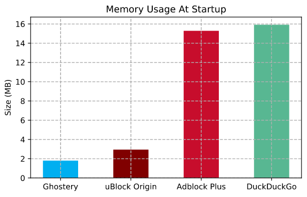 > uBlock Origin, требующие для работы 2-3 Мб ОЗУ. Потребление памяти Adblock Plus и DuckDuckGo составило приблизительно 15-16 Мб.