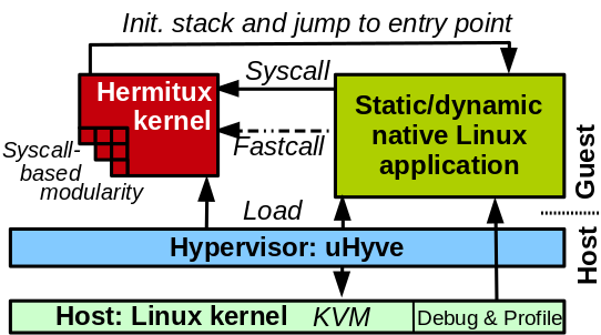 Не совсем понятен смысл. Ядро линукса может зарезать сисколлы. Эксплоитам уровня ядра придётся эксплуатировать уязвимость в оставшихся сисколлах. Которые HermiTux любезно пробрасывает.