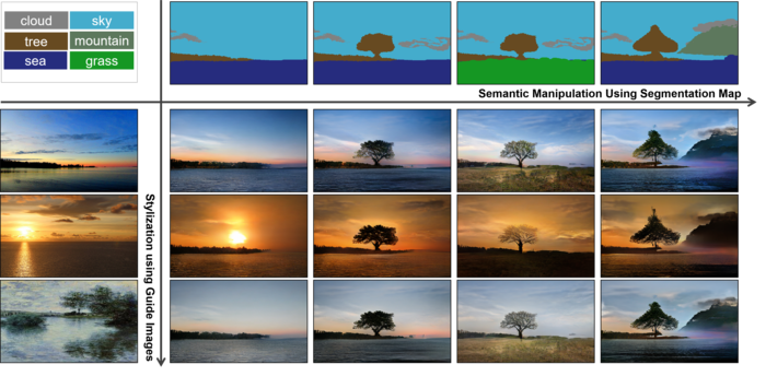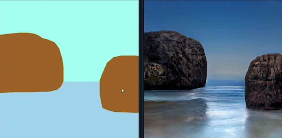 > Объекты синтезируются генеративно-состязательной нейронной сетью (GAN), которая на основе схематичной сегментированной карты создаёт реалистичные изображения, заимствуя детали из модели, предварительно обученной на нескольких миллионах фотоснимков
