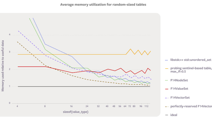 Компания Facebook объявила об открытии исходных текстов реализации хэш-таблиц F14, оптимизированной для эффективного потребления памяти. F14 используется в инфраструктуре Facebook в качестве замены большинства типов хэш-таблиц и позволяет снизить потребление памяти без потери производительности. F14 заметно превосходит по производительности хэш-таблицы google::sparse_hash_map, до сих пор считавшиеся наиболее эффективными по потреблению памяти. Код проекта написан на языке C++ и включен в состав библиотеки Folly.