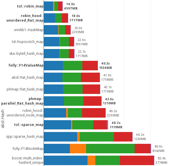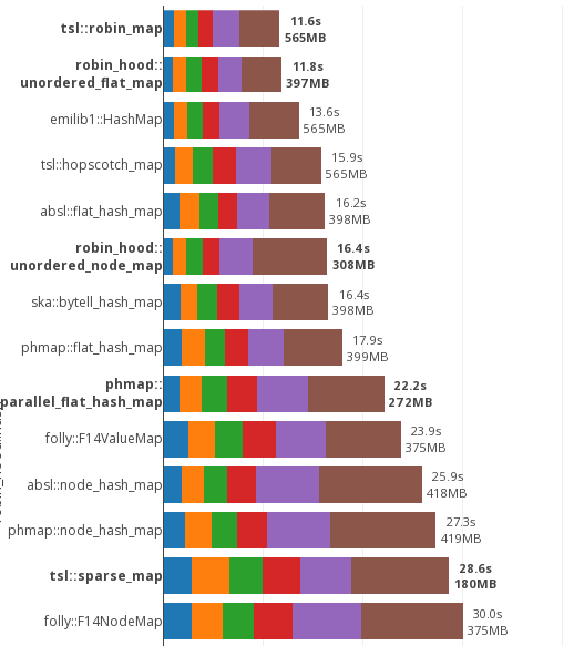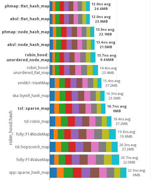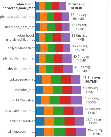 В тестах на заполнение методы robin_hood::unordered_flat_map и ska::bytell_hash_map потребляют примерно на 10% больше памяти, но в 2 раза быстрее.