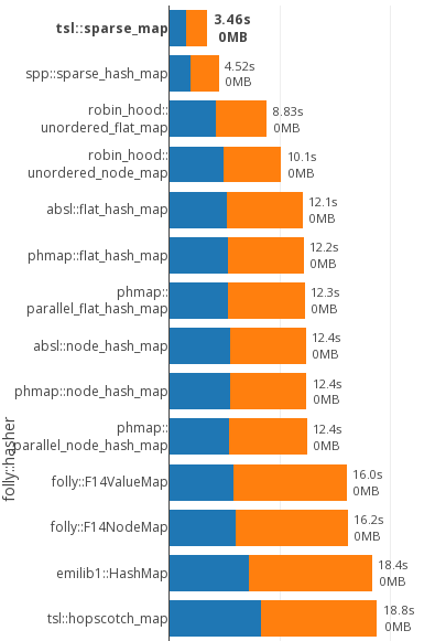 В тесте по полному перебору всех элементов лидером оказался tsl::sparse_map, которые в других тестах обгонял F14 и по потреблению памяти.