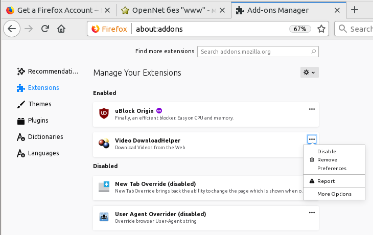 Отключение Recommended Extensions из about:addons: