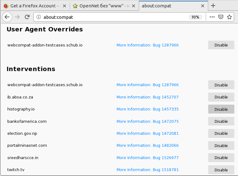 >применяемые для обеспечения совместимости с отдельными сайтами, которые некорректно работают в Firefox