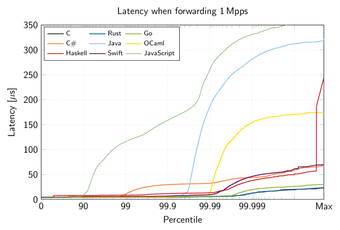 Swift increments a reference counter for each object passed into a function and decreases it when leaving the function. This is done for every single packet as they are wrapped in Swift-native wrappers for bounds checks. There is no good way to disable this behavior for the wrapper objects while maintaining an idiomatic API for applications using the driver. A total of 76% of the CPU time is spent incrementing and decrementing reference counters. This is the only language runtime evaluated here that incurs a large cost even for objects that are never free’d.