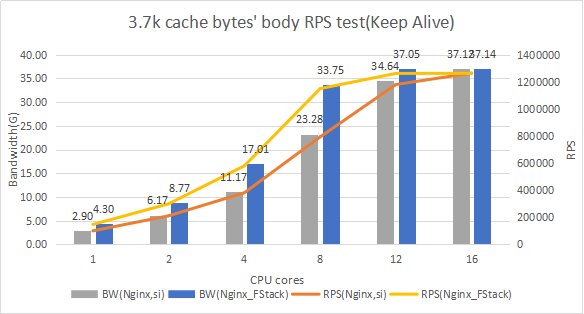 дело не в большей производительности, а том что f-stack расположен полностью в пространстве пользователя. Это позволяет избавиться от лишних аллокаций и переключений контекста, а так как они зависят от числа пакетов, то наибольшая выгода будет достигаться в сценариях с кучей мелких пакетов. Что ты и видишь на графике.