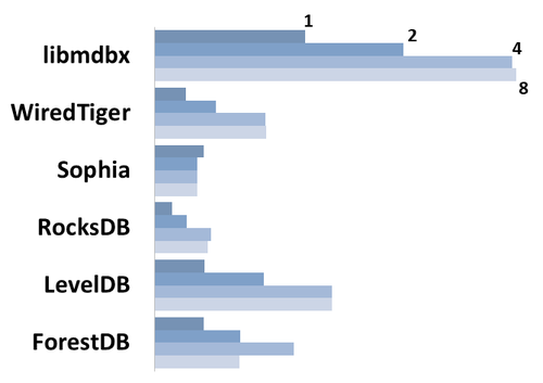 На графике показаны результаты теста на ноутбуке 2013-го года, с i7-4600U у которого "на самом деле" два ядра (4 в режиме HyperThreading). Информация о модели CPU есть в [README](https://github.com/leo-yuriev/libmdbx#performance-comparison). Кроме этого, там достаточно быстро узким местом становится memory bandwidth.