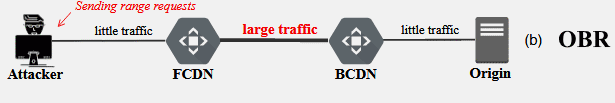 На цдн отрпасляется 100 запросов по 1 байту из 100 файлов. Цдн range запросы понимает и отправляет 100 range запросов, пускай на 1кБ, запросы на защищаемый сервер. А вот защищаемый range запросы не умеет, по этому на каждый из 100 запросов от отвечает 1МБ+ файлами. Вы же не забыли, что если range заголовок не обрабатывается сервером, то возвращается всё содержимое, да?