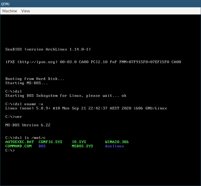 Ты не понял, это виртуалка с линуксом "в досе". Вопрос должен быть "зачем использовать дос?". Ни зачем, ни незачем, очевидно, что лулзов ради.