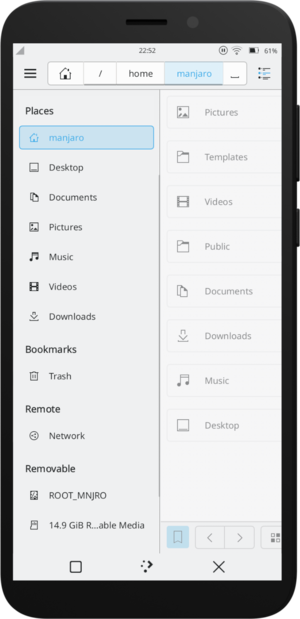 > Для создания интерфейса приложений применяется Qt, набор компонентов Mauikit и фреймворк Kirigami из состава KDE Frameworks, позволяющий создавать универсальные интерфейсы, пригодные для смартфонов, планшетов и ПК.