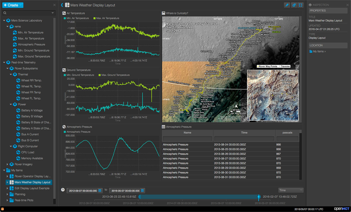 Open MCT позволяет в одном сводном интерфейсе отображать потоки как поступающих в данным момент, так и уже полученных данных (анализ истории), оценивать состояние датчиков, выводить изображения с камер, выполнять навигацию по событиям с использованием шкалы времени, визуализировать любую информацию, использовать разные представления телеметрии (таблицы, графики, диаграммы и т.п.). Оператор может быстро переключаться между разными обработчиками и представлениями данных, менять размер областей, компоновать собственные представления в визуальном редакторе, перемещать элементы в режиме drag&drop. Платформа очень гибкая и при помощи плагинов может адаптироваться для различных применений, форм представления информации, типов и источников данных.