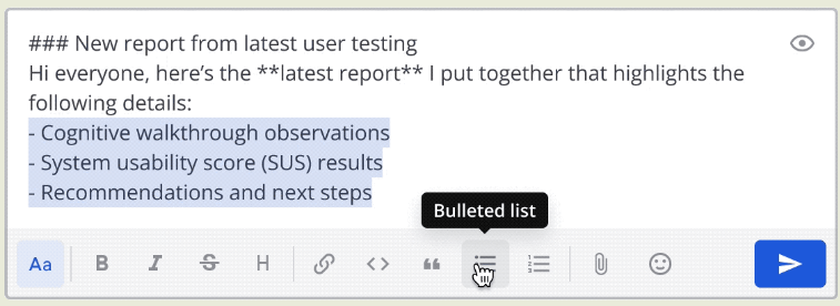 • В интерфейсе для общения в каналах реализована панель с инструментами для форматирования сообщений, позволяющая использовать разметку без изучения синтаксиса Markdown.