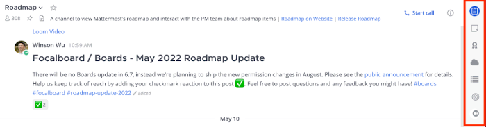 • Реализована экспериментальная поддержка голосовых вызовов и предоставления совместного доступа к экрану. Голосовые вызовы доступны как в настольном и мобильном приложениях, так и в web-интерфейсе. Во время голосового общения команда может параллельно продолжать общаться в текстовом чате, управлять проектами и задачами, просматривать контрольные списки и выполнять любые другие действия в Mattermost, не прерывая вызова.