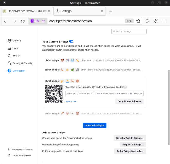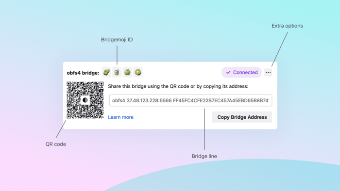 Изменено оформление информационных карт с данными мостовых узлов, при помощи которых можно сохранять работающие мосты и обмениваться ими с другими пользователями. В дополнение к кнопкам для копирования и отправки карты мостового узла добавлен QR-код, который можно отсканировать в версии Tor Browser для Android.