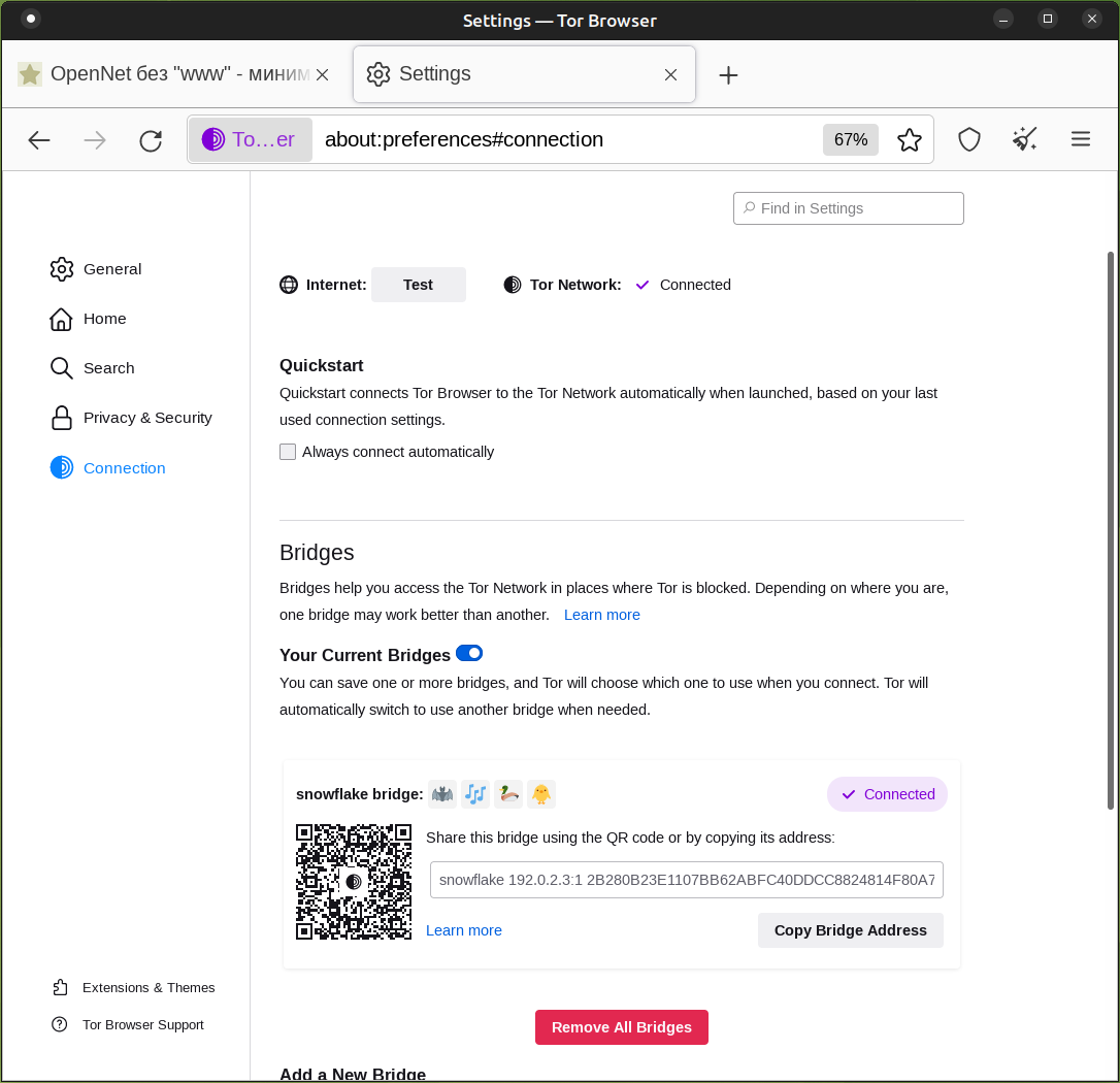 > В верхней части вкладки с настройками обеспечено отображение текущего состояния соединения и предоставлена кнопка для проверки работоспособности прямого подключения (не через Tor), позволяющая диагностировать источник проблем с соединением.