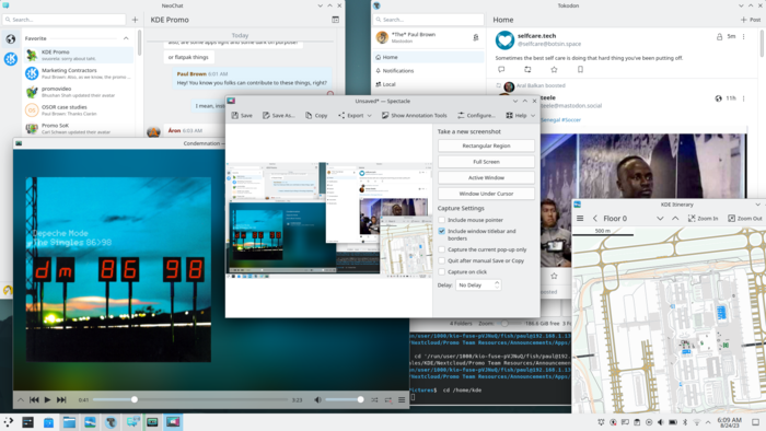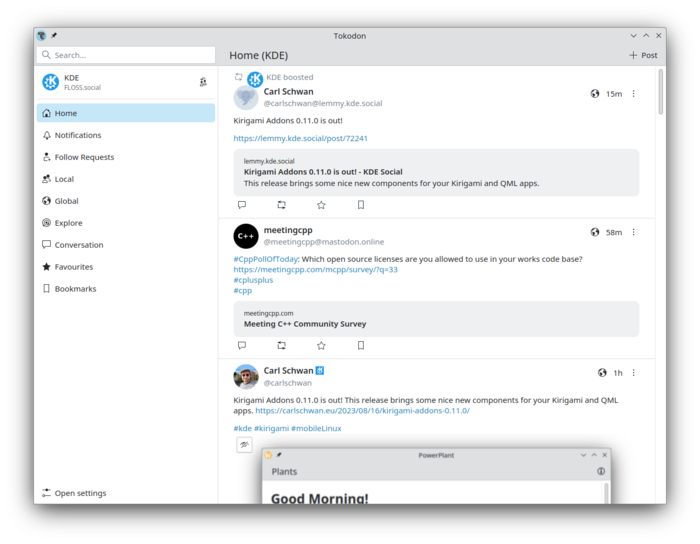 • Переработано оформление приложения Tokodon с реализацией клиента к децентрализованной микроблогинговой платформе Mastodon. Добавлены инструменты для модерирования и управления собственным сервером Mastodon, а также для управления пользователями и для настройки подсоединения к другим серверам. Кроме того, добавлена поддержка отправки сообщений через другие приложения, сохранения токена доступа при помощи KWallet, просмотра всех заблокированных или замороженных учётных записей, привязки статуса к профилю, просмотра набирающих популярность тегов.