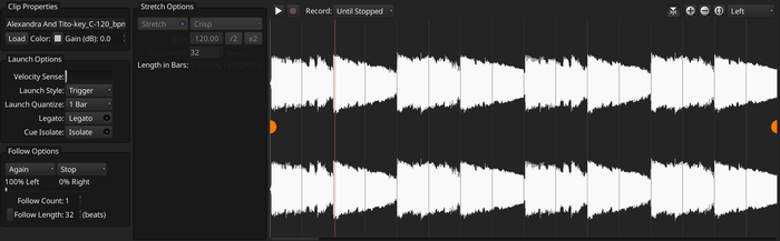 - Добавлена поддержка прямой записи в cue-слоты для создания в реальном времени зацикленных композиций (лупов) в стиле приложений Live и Bitwig. Можно заранее задать длительность записи (например, "записать 4 такта") или записывать до остановки вручную. Запись воспроизводится со следующей точки квантования, например, с начала такта.