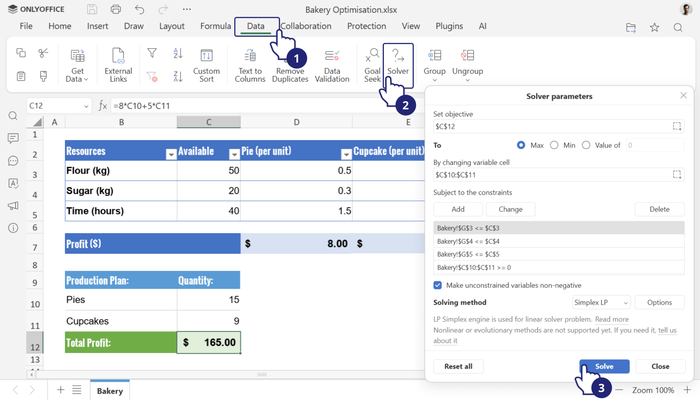 - В редакторе электронных таблиц проведена оптимизация начальной отрисовки больших таблиц, занимающих более 3 МБ. Добавлен инструмент "Solver", который позволяет решать задачи линейного программирования прямо в таблице с использованием симплекс‑метода.