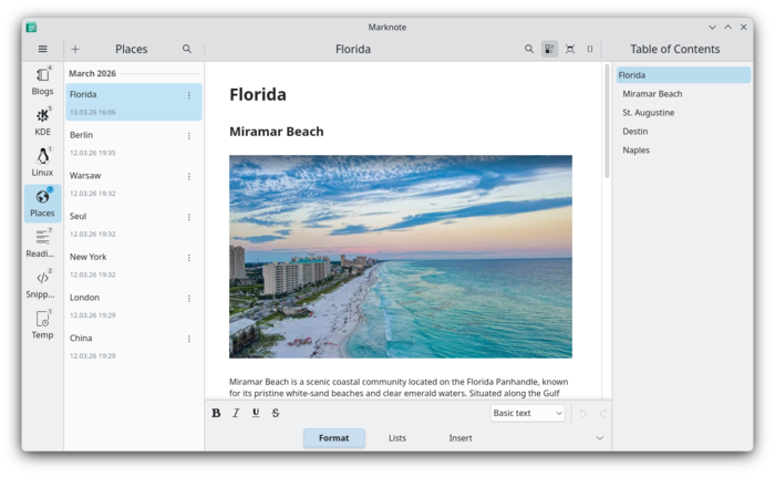 - Опубликован выпуск Marknote 1.5, приложения для создания и управления коллекцией текстовых заметок, сохраняемых в формате Markdown. В новой версии помимо ранее доступного WYSIWYG-режима визуального редактирования текста, добавлен режим для работы с исходной разметкой Markdown. Также добавлена поддержка вставки ссылок между заметками, реализован полнотекстовый поиск и предложен плагин для интеграции с KRunner.