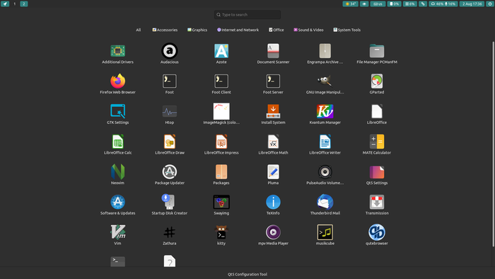Окружение дистрибутива построено на основе Sway - композитного менеджера, использующего протокол Wayland и полностью совместимого с мозаичным оконным менеджером i3, а также панели Waybar, файлового менеджера PCManFM-GTK3 и утилит из проекта NWG-Shell, таких как менеджер обоев рабочего стола Azote, полноэкранное меню приложений nwg-drawer, программа для вывода содержимого скриптов на экран nwg-wrapper (используется для отображения подсказки по горячим клавишам на рабочем столе), менеджер настройки тем GTK, курсора и шрифтов nwg-look и скрипт Autotiling, автоматически компонующий окна открытых приложений на манер динамических мозаичных оконных менеджеров. В состав дистрибутива входят программы как с графическим интерфейсом, такие как Firefox, Qutebrowser, Audacious, Transmission, Libreoffice, Pluma и MATE Calc, так и консольные приложения и утилиты, такие как музыкальный проигрыватель Musikcube, видеопроигрыватель MPV, утилита для просмотра изображений Swayimg, утилита для просмотра документов PDF Zathura, текстовый редактор Neovim, файловый менеджер Ranger и другие. Другой особенностью дистрибутива является полный отказ от использования пакетного менеджера Snap, все программы поставляются в виде обычных deb-пакетов, в том числе веб-браузер Firefox, для установки которого задействован официальный PPA-репозиторий Mozilla Team. Установщик дистрибутива основан на фреймворке Calamares. В новом выпуске осуществлен переход на пакетную базу Ubuntu 25.10, задействован компонент swaykbdd для установки индивидуальной раскладки клавиатуры для каждого окна, проведены небольшие оптимизации системных скриптов и устранен ряд мелких недоработок. ![]() ![]()