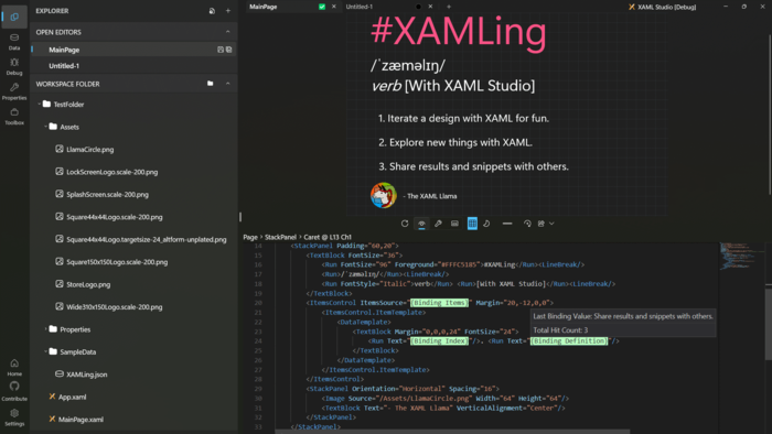 Среда разработки включает в себя интерактивный редактор кода, позволяющий на лету создавать интерфейс, наглядно оценивать изменения интерфейса по мере редактирования XAML-кода и взаимодействовать с разрабатываемым приложением как с отдельно запущенной программой. В состав также входит отладчик и редактор для привязки данных. Открытый код соответствует выпуску XAML Studio 1.1. На основе этого кода уже началась разработка ветки XAML Studio 2, в которой будет реализованы средства для проектирования интерфейса на базе Fluent UI, возможности для загрузки изображений и данных, панель для редактирования и инспектирования свойств, панель для визуальной навигации по свойствам и их состоянию. ![]()