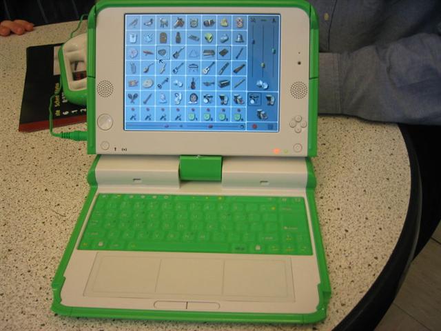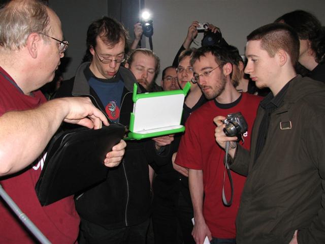 Раньше я уже краем уха слышал про этот effort, но честно говоря поразился сколько различных проблем было разрешено в процессе его реальзации. Была поставлена цель разработать сверхдешёвый ноутбук которым могли бы пользоваться дети в развивающихся странах. Проект финансируется ООН. Ноутбук должен быть лёгким, с экраном которым можно пользоваться на ярком солнечном свете, с минимальным энергопотреблением, развитыми сетевыми возможностями, позволяющими группе таких устройств автоматически объединяться в mesh-networks и прочими нетривиальными способностями. Нам продемонстрировали результат - весьма компактный ноутбук по цене производства менее 100$. После презентации докладчика плотно обступили чтобы посмотреть его детище: