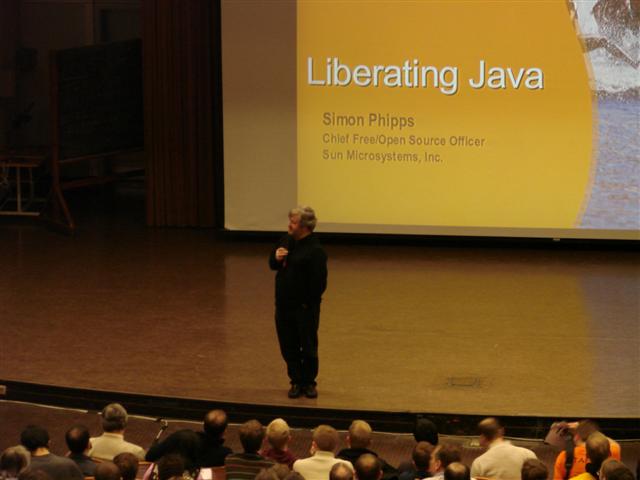 Тут перед нами выступал вице-президент Sun по open source решениям. Великолепный докладчик, он быстро завладел аудиторией. Говорил, что его фирма внесла наибольший вклад в open source разработки - около 30-40% всего кода. IBM и Oracle тоже неплохо помогли, 10 и 7 % соответственно. Потом спросил: "Так за что же вы нас так не любите?" Да, мол мы на этом потом деньги зарабатываем, но мы ведь и целые команды разработчикоов держим которые работают всецело над open source проектами. Зал погудел, но похоже согласился. Тем более что официальная тематика презентации была про открытие исходников явы. Большинство людей, с которыми мне удалось поговорить сходятся во мнении, что Sun проиграл в своей битве с MS. Потому и открыл в конечном счёте исходники, в надежде что сообщество доработает и улучшит существующую реализацию.