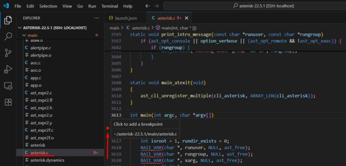 Открываем файл pbx/pbx_config.c на строке 2151 и ставим breakpoint на функции