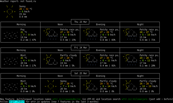 | 9.50, Ergil (ok), 05:31, 29/03/2017 [^] [^^] [^^^] [ответить] | +/– |  Да он у вас много чего находит curl wttr in Жопа Показывает погоду для 171 ... текст свёрнут, показать | | |